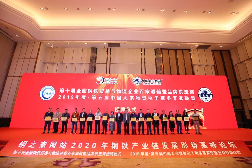 11月2日下午17時30分,第十屆“全國鋼鐵貿(mào)易與物流企業(yè)百家誠信暨品牌供應(yīng)商”和“2019?年度第五屆中國大宗物資電子商務(wù)百家聯(lián)盟”授牌儀式舉行。誠鋼集團榮獲“第十屆全國鋼鐵貿(mào)易與物流企業(yè)百家誠信暨品牌供應(yīng)商”,鞍鋼股份有限公司市場營銷中心副總經(jīng)理閻東宇先生為誠鋼集團董事長顧靖先生頒授獎牌。
