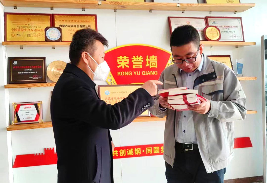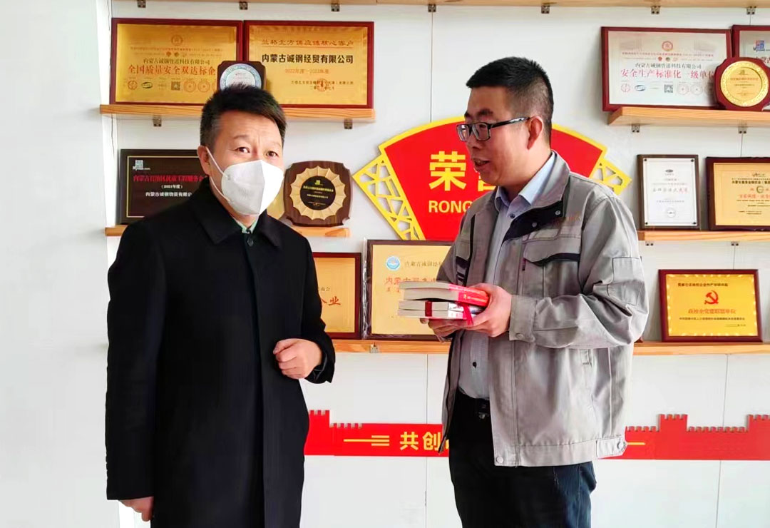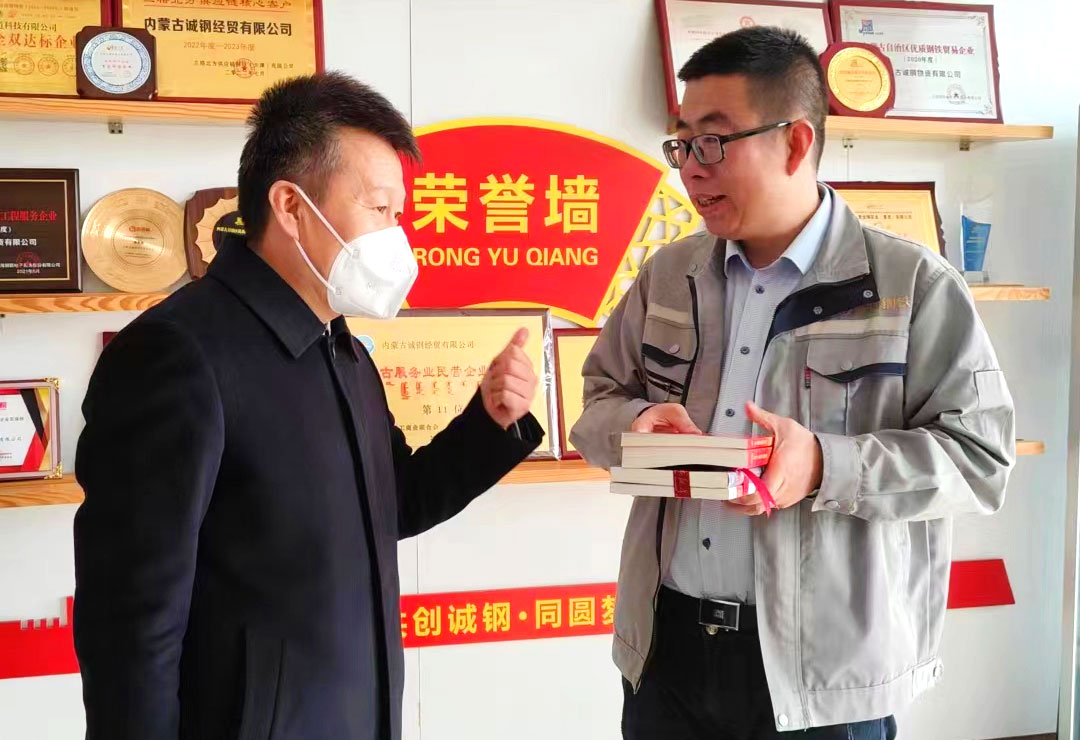 黃鳳山書記代表工商聯(lián)感謝顧靖先生在內(nèi)蒙古鋼鐵生產(chǎn)銷售行業(yè)協(xié)會的籌建和社會活動中做出的貢獻,高度認可在疫情防控期間行業(yè)協(xié)會和誠鋼鋼鐵對防控工作的支持和引導(dǎo)作用。并且向顧靖先生和企業(yè)員工送上《黨的二十大報告學(xué)習(xí)輔導(dǎo)百問》和提升企業(yè)創(chuàng)新能力等方面的書籍。